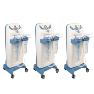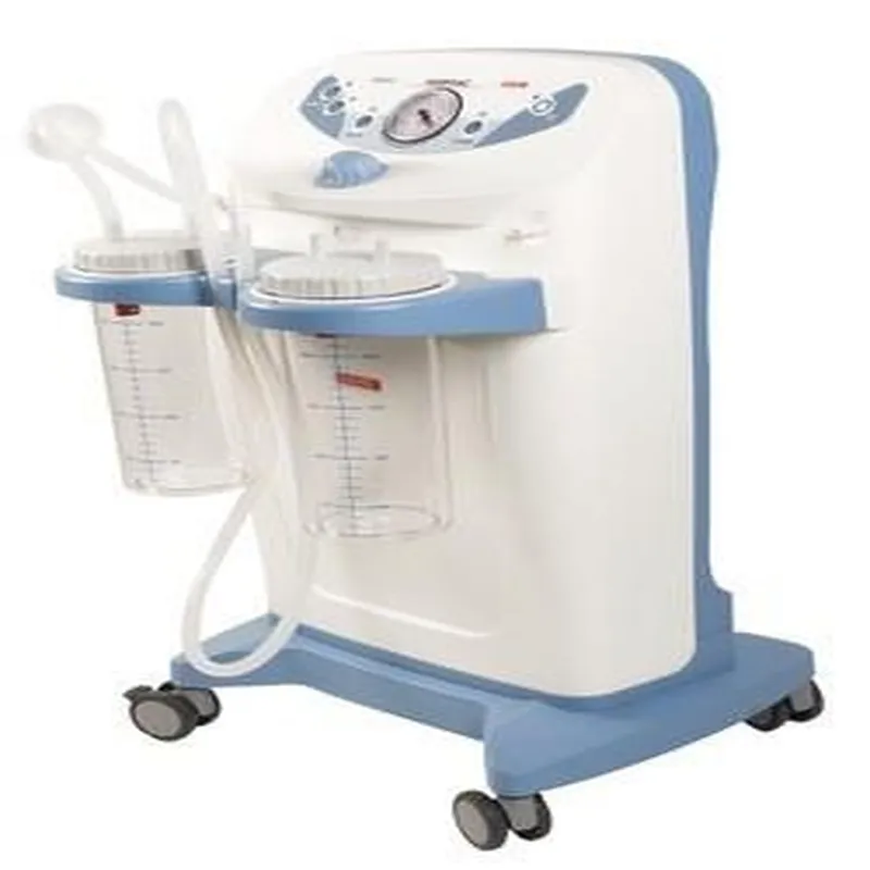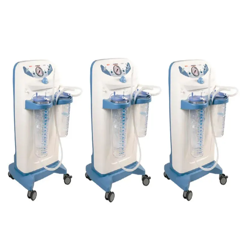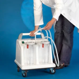 Its dual 2L polycarbonate autoclavable jars with overflow protection allow extended operation without frequent emptying. The unit is mounted on anti-static castor wheels with brakes and includes an ergonomic handle for easy transport across wards and operating rooms. A front-panel vacuum regulator, illuminated switch, and clear dashboard provide intuitive control and real-time monitoring.